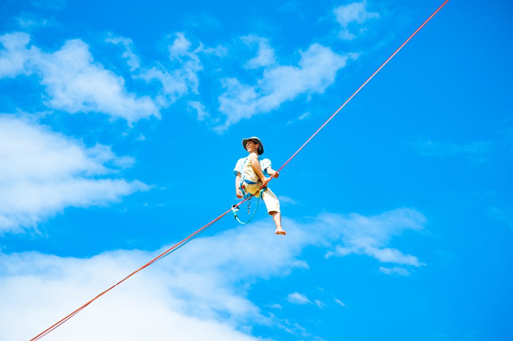 山口県に移住後は良質なハイラインスポット(高所綱渡り)エリアを次々に開拓。日本人でただ一人、命綱なしのフリーソロを行うハイライナーとしての地位を確立する。